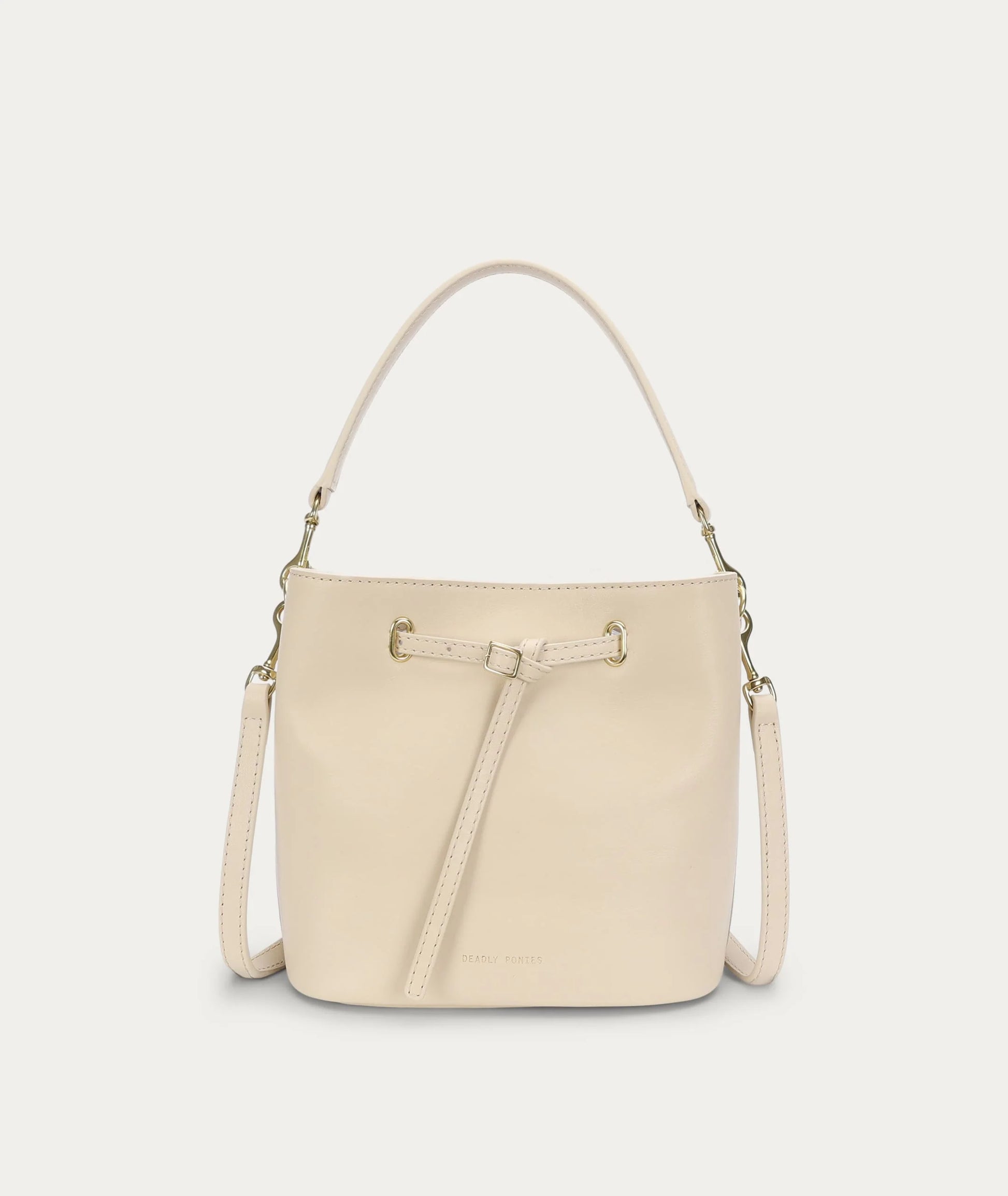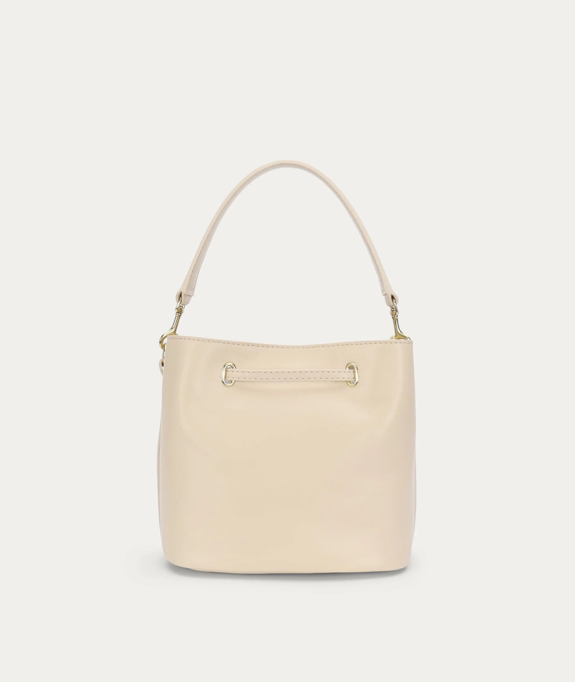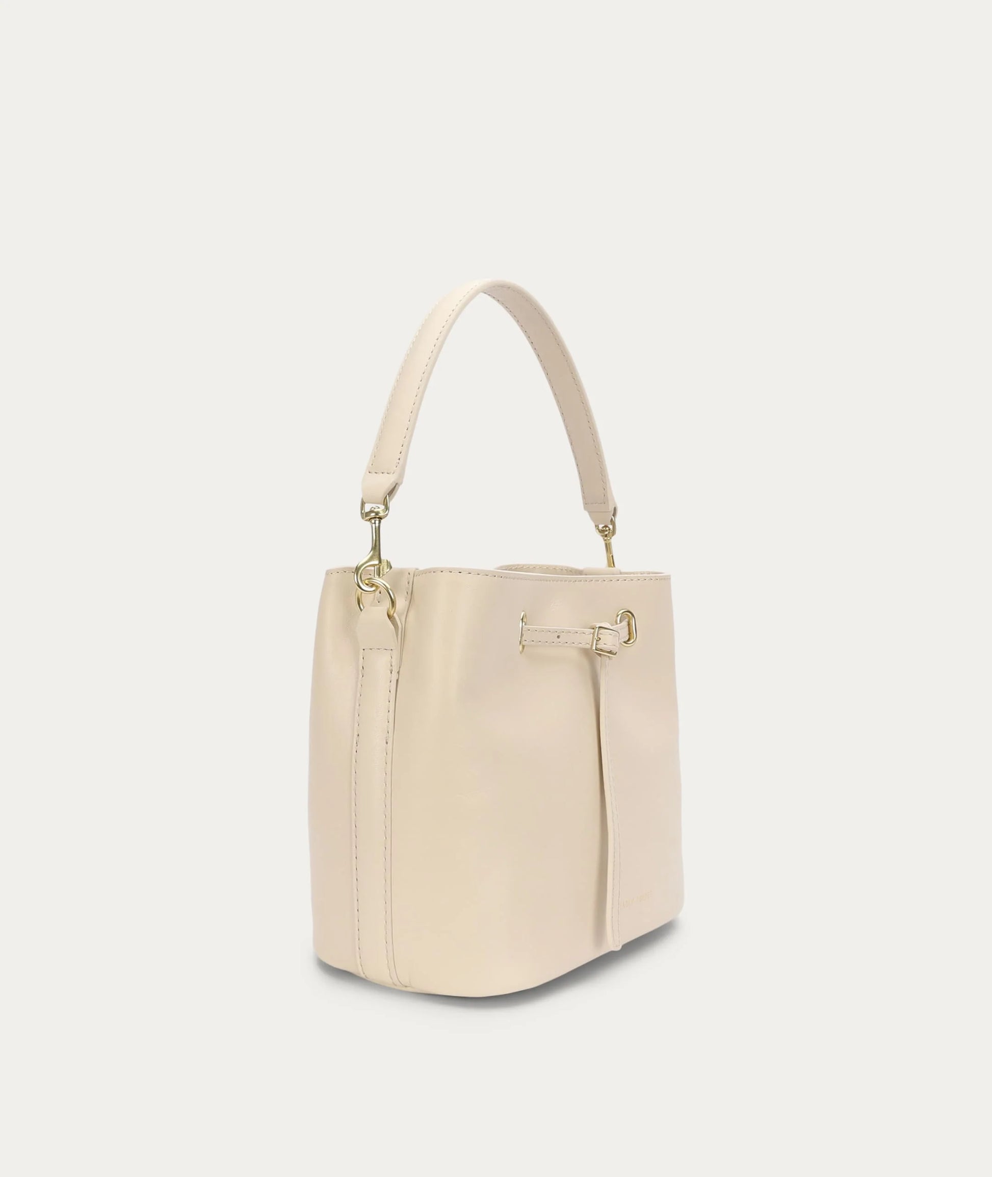 Mr Penny in Procelain reimagines the classic bucket bag in supple LWG-certified Ironed Calf Nappa with solid brass hardware. Featuring leather detailing threaded through brass eyelets, a detachable top handle, adjustable strap, and a removable cotton pouch.
