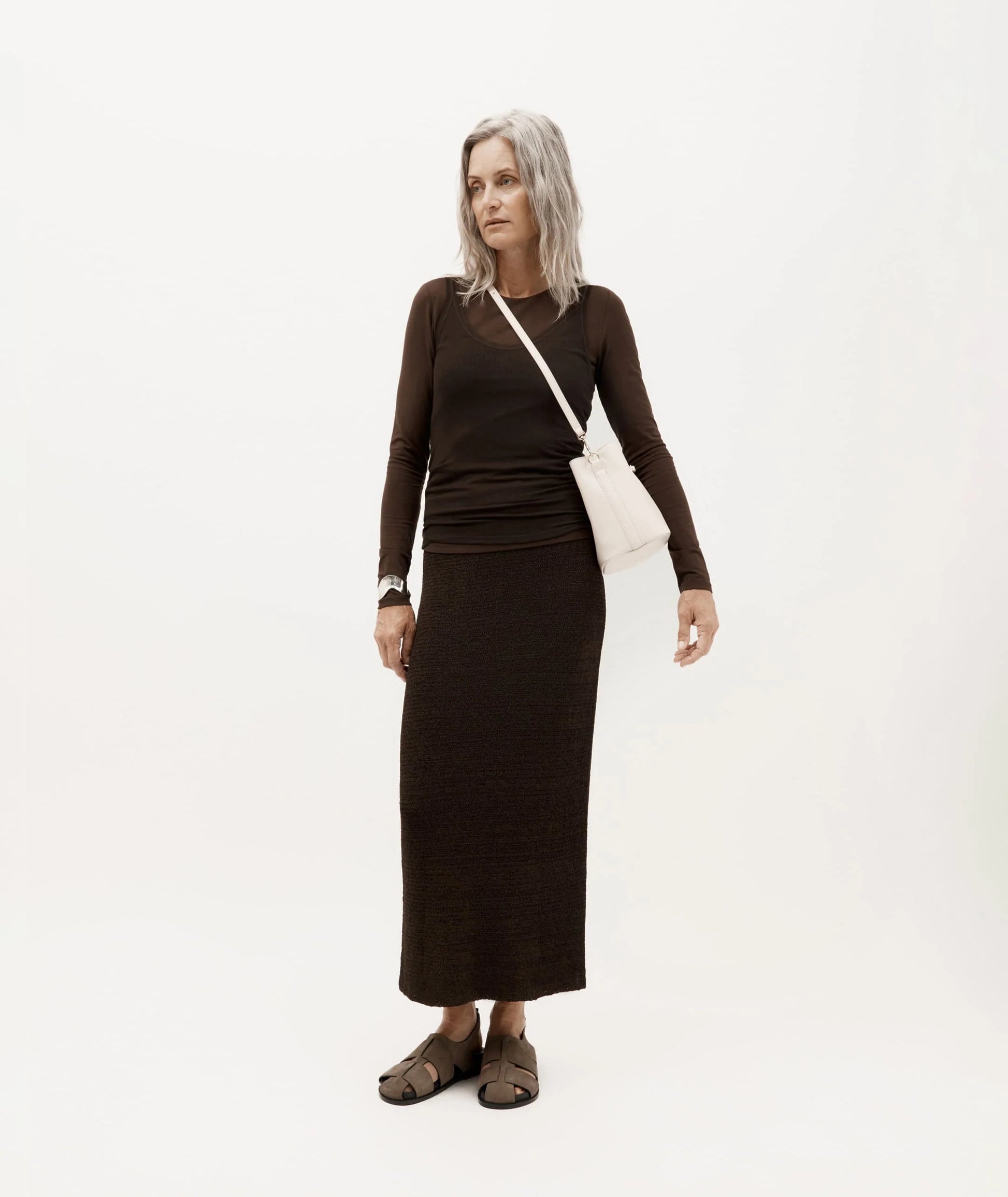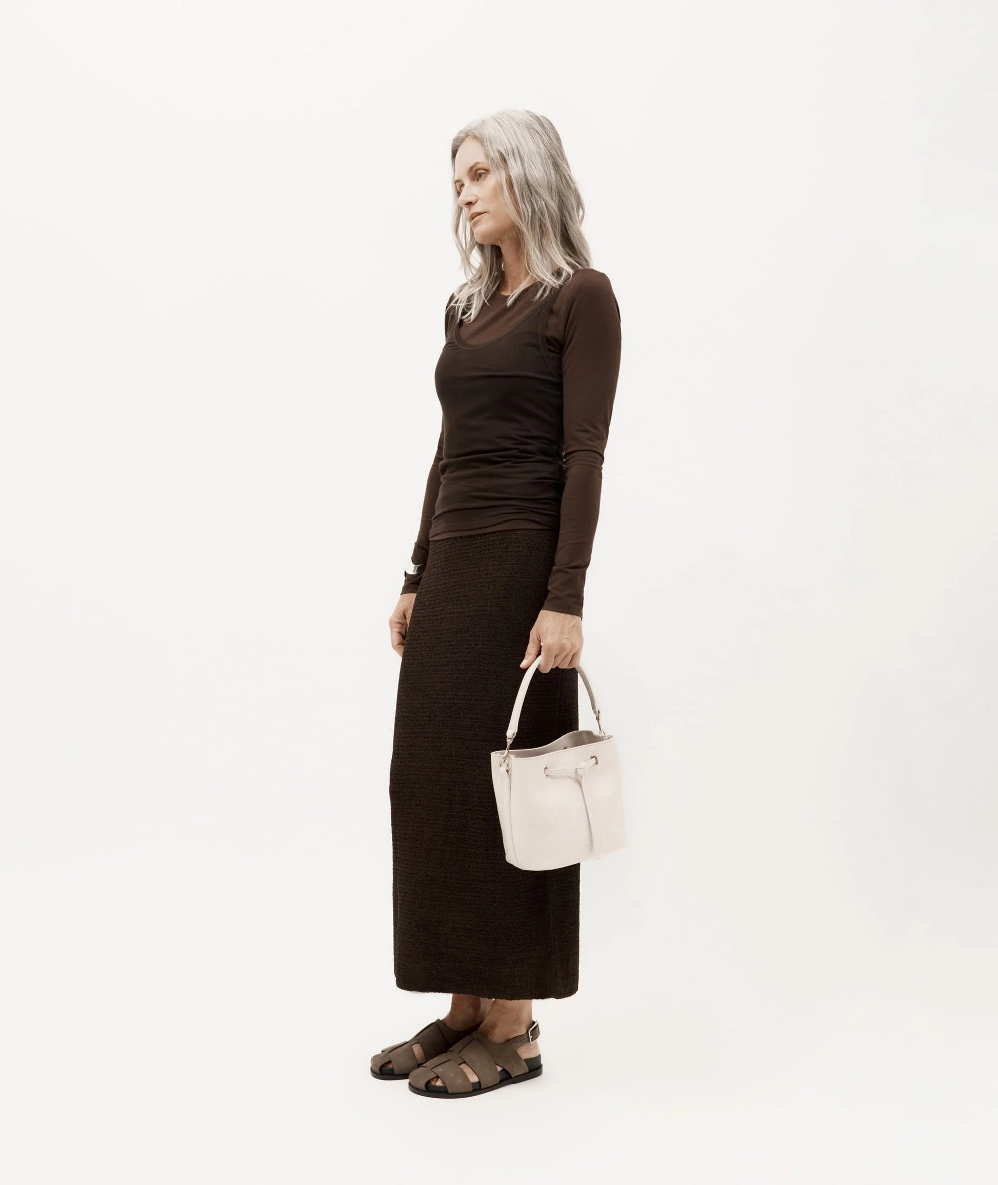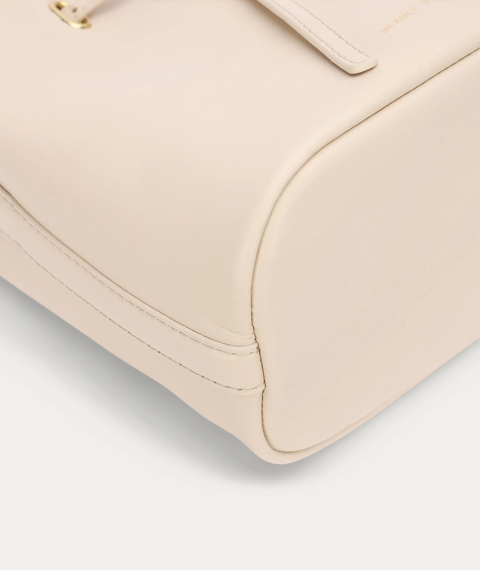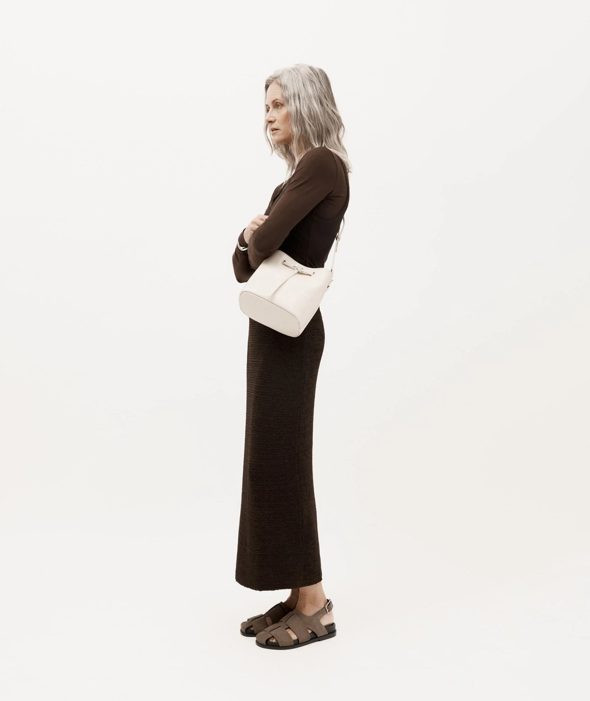 Mr Penny in Procelain reimagines the classic bucket bag in supple LWG-certified Ironed Calf Nappa with solid brass hardware. Featuring leather detailing threaded through brass eyelets, a detachable top handle, adjustable strap, and a removable cotton pouch.