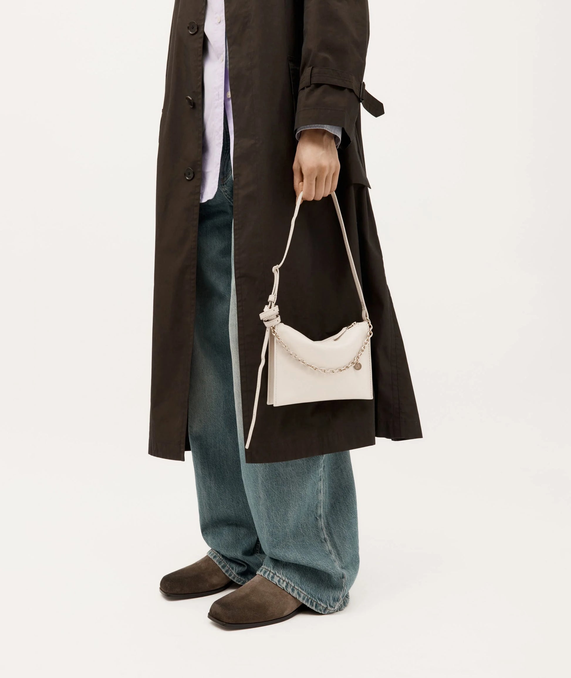 Mr Minimese is a lightweight, compact double-gusset clutch crafted from a single piece of LWG-certified Ironed Calf Nappa in Porcelain. His folded design creates a streamlined silhouette and can be worn crossbody or as a shoulder bag with the fixed adjustable strap.